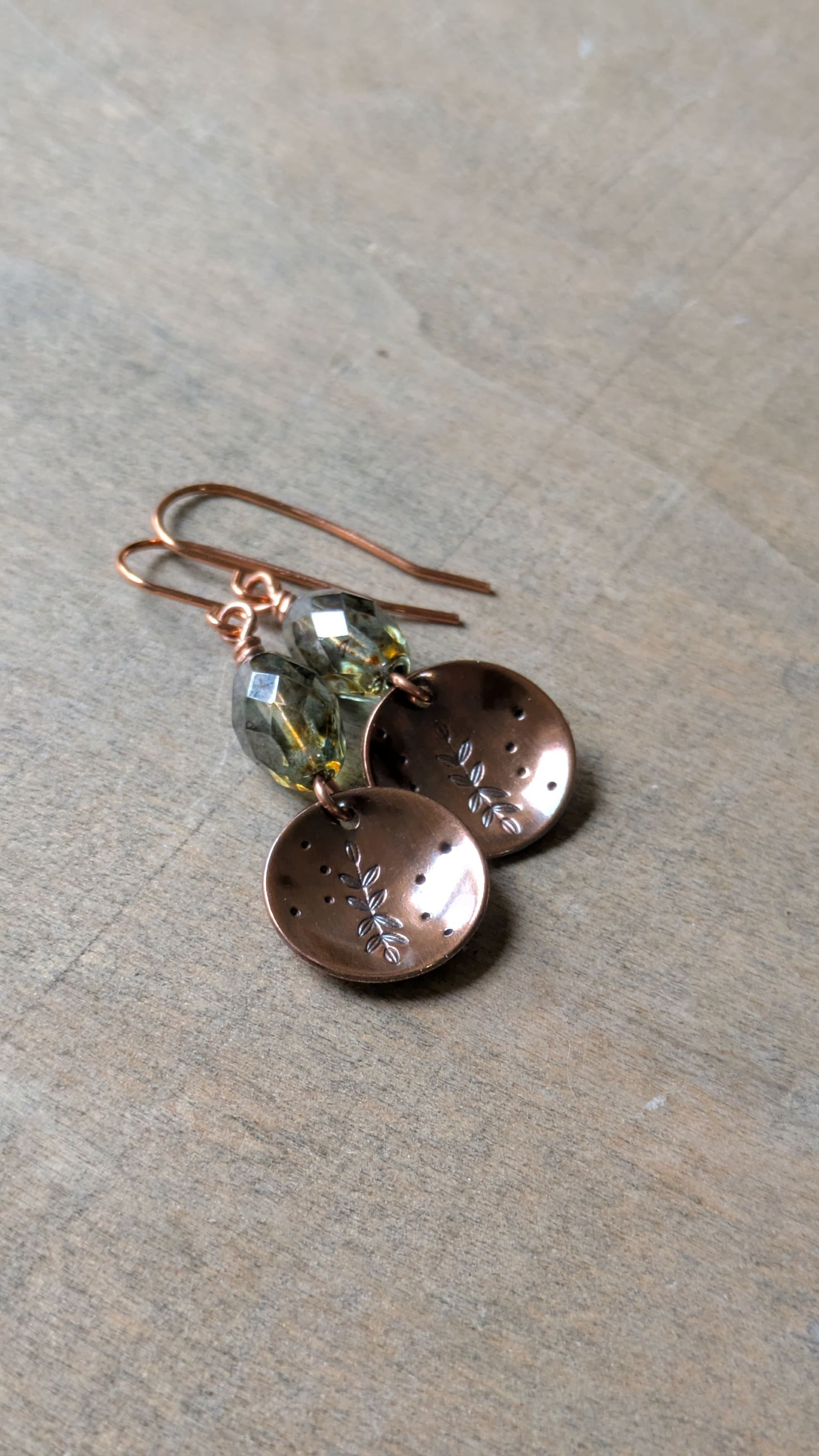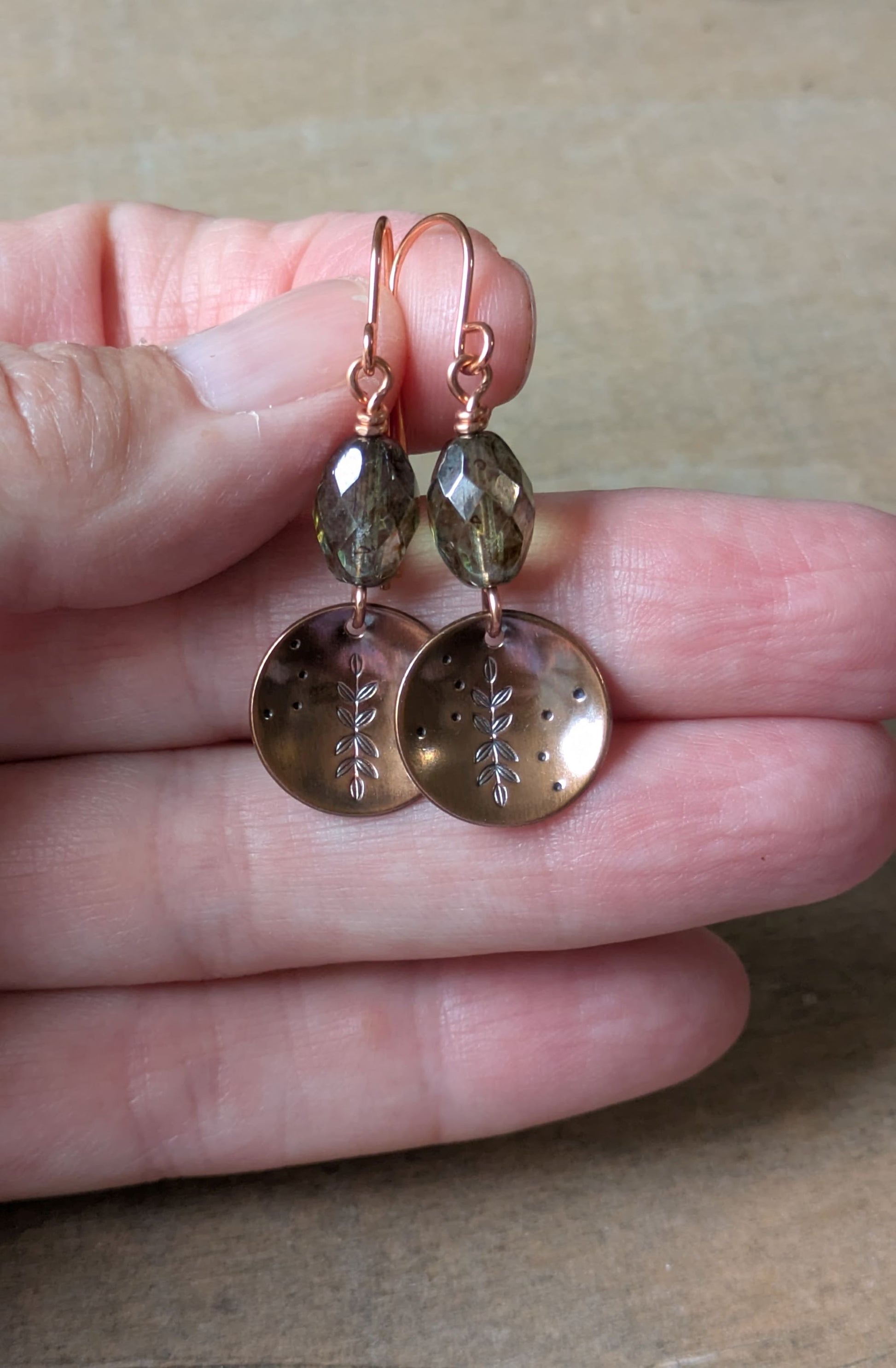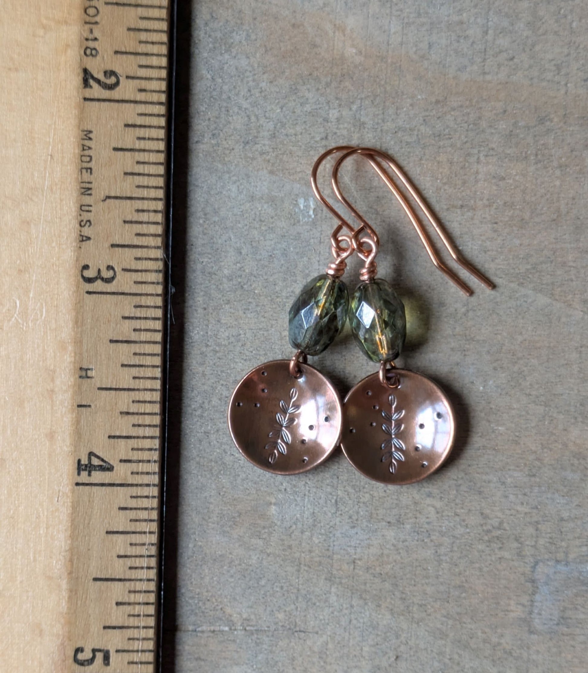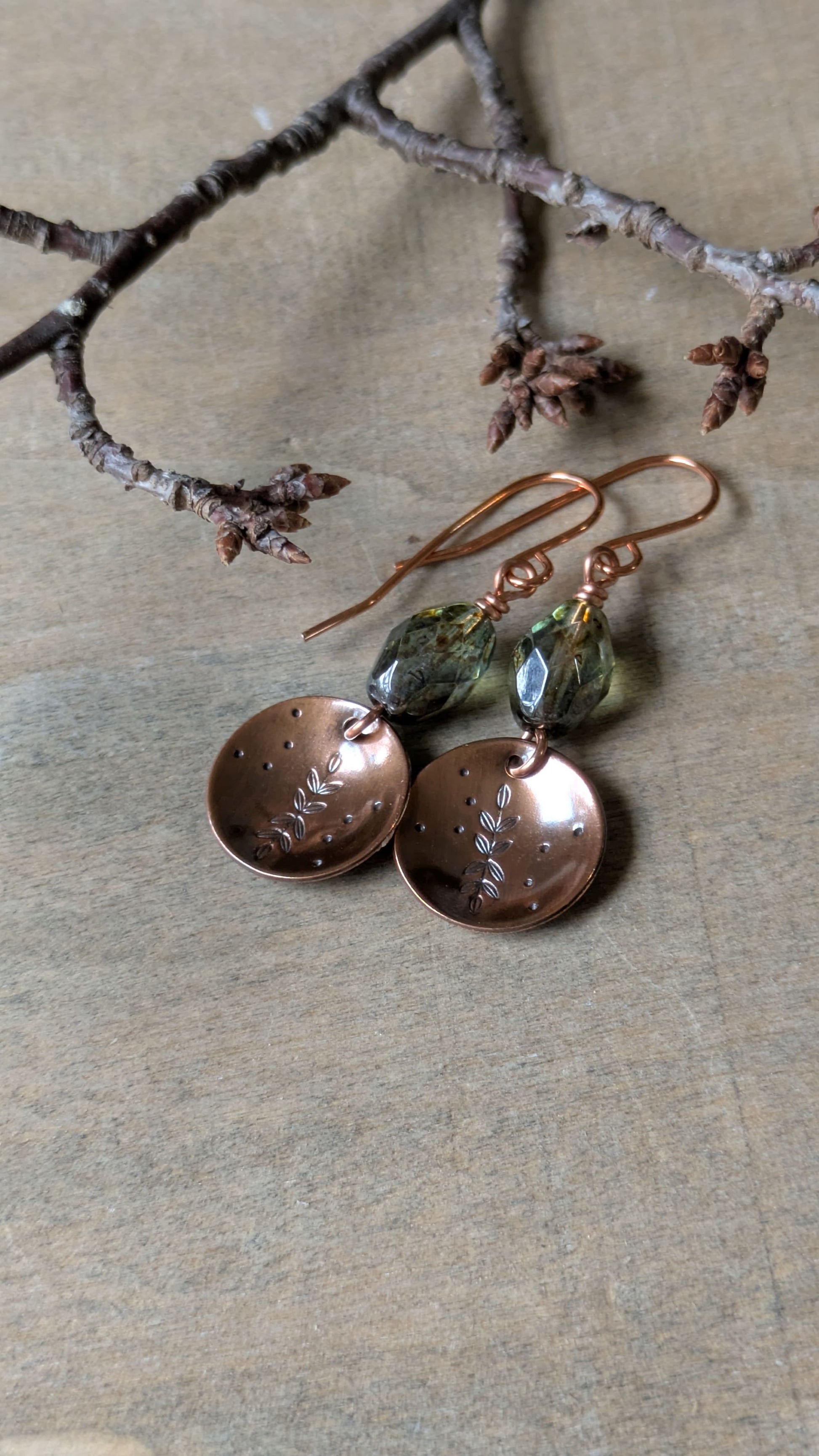 A handstamped copper disc with lone leafy branch dangles below a beautiful moss green czech glass bead. I cut the disc out of sheet metal and stamped the design by hand~so each one will vary slightly. I have given these a patina that brings out the details of the stamping.