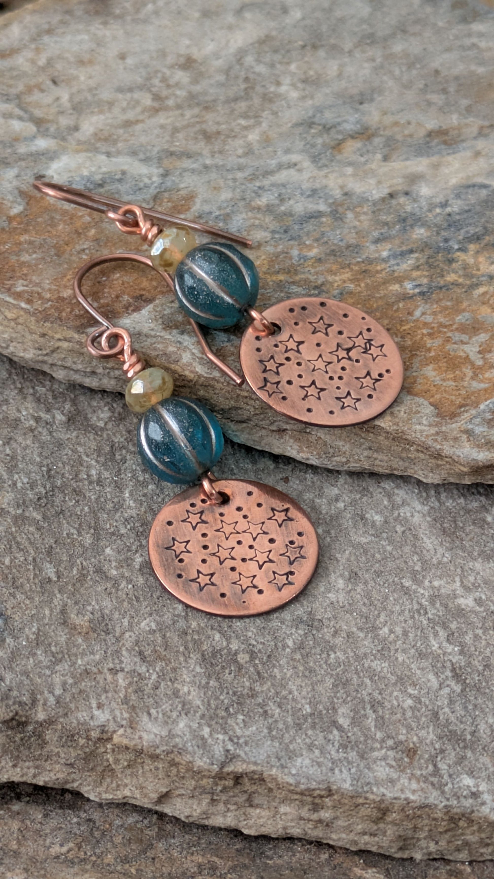 A starry sky has been hand stamped on each disc that hangs below a soft blue glass bead. I've placed a small shimmering bead above the blue bead to mimic a twinkling star. I cut the disc out of sheet metal and stamped the design by hand~so each one will vary slightly. I have given these a patina that brings out the details of the stamping.