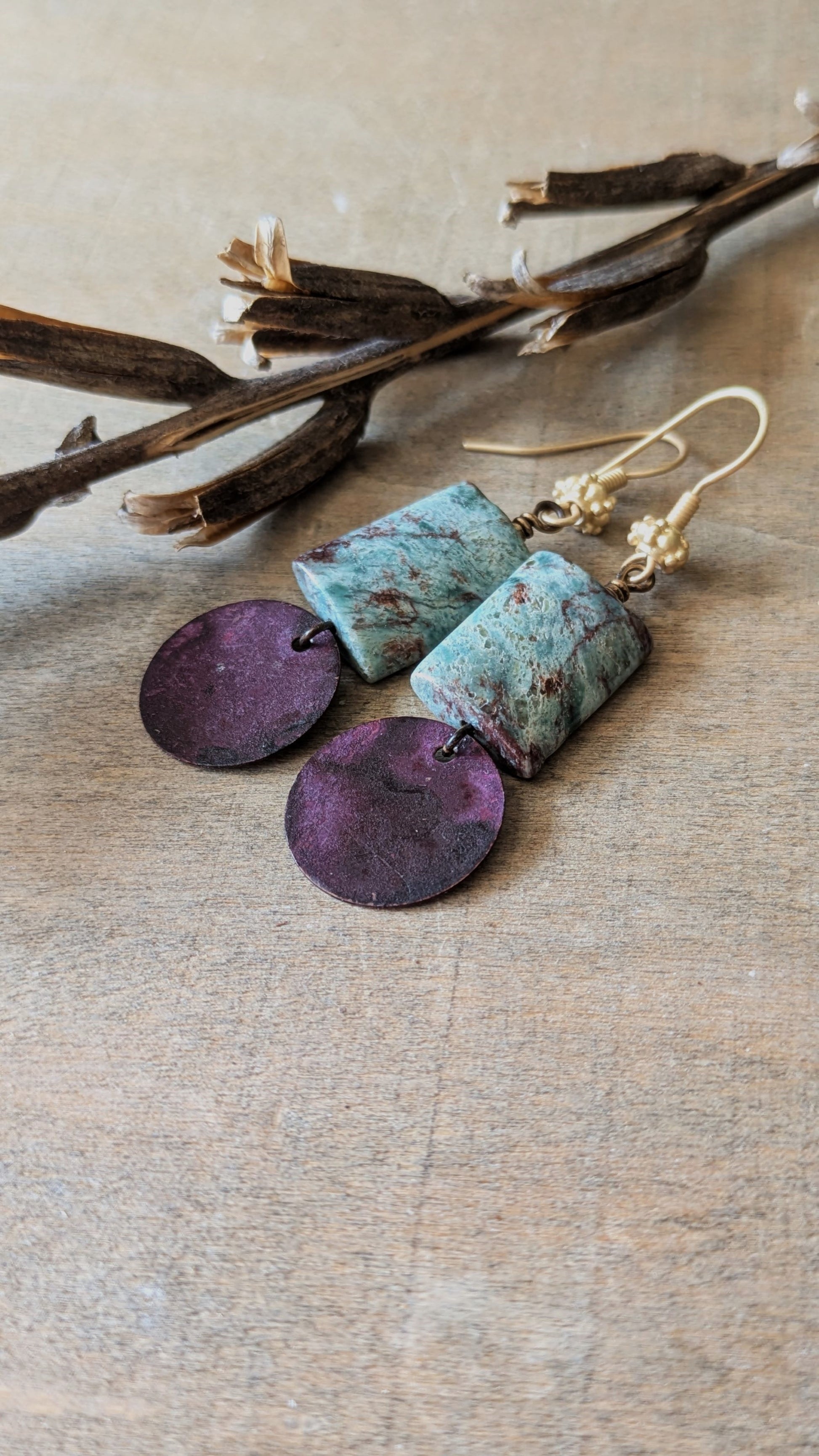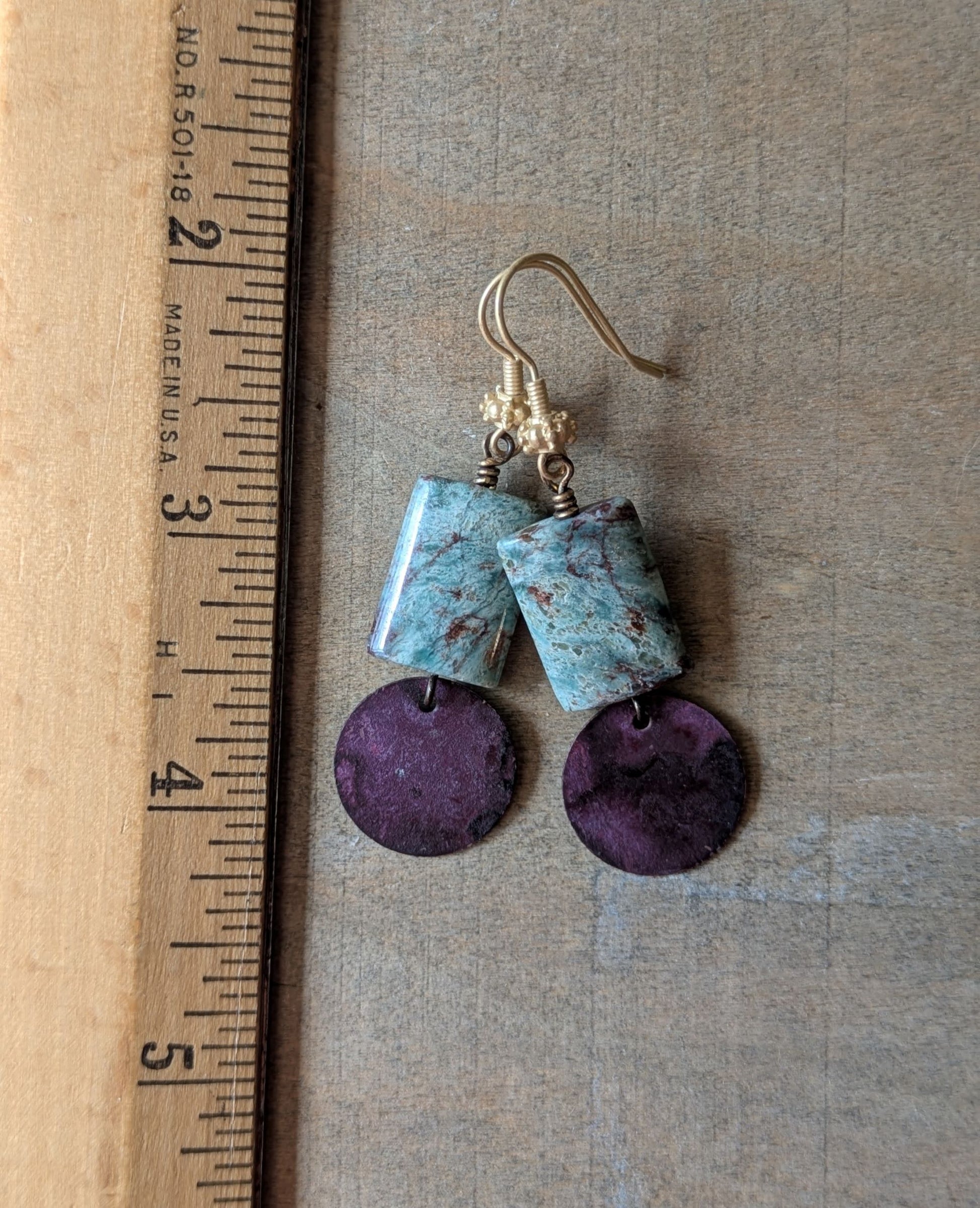 I lucked upon some brass dangles with beautiful patinas and made a little collection. This pair combines beautiful rectangles of jasper with green and purple hues sitting above a purple patinated brass disc. These measure just a touch under 2 1/2" from the tops of the brass ear wires. The last photo shows the other earrings in the collection.