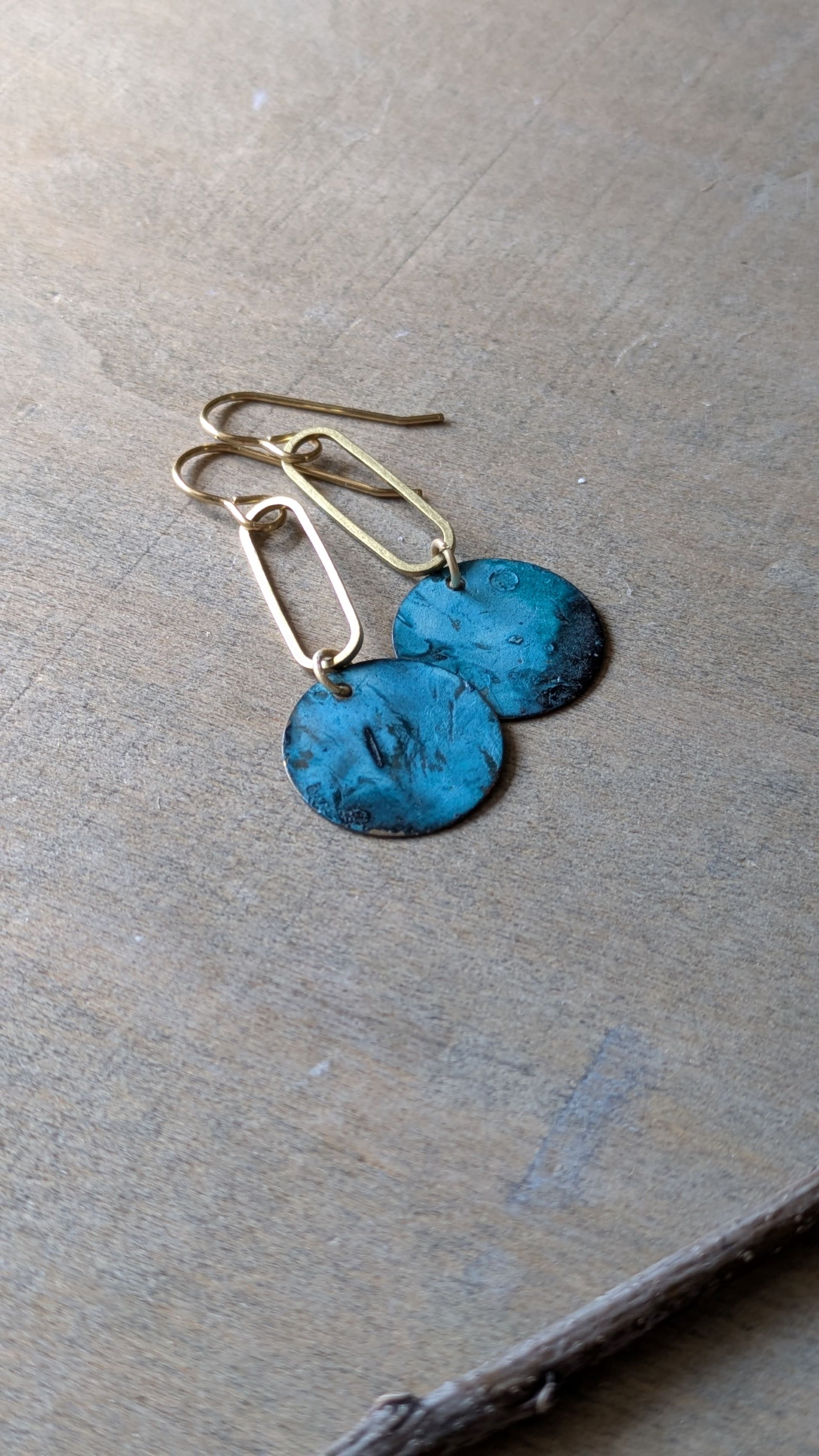 I lucked upon some brass dangles with beautiful patinas and made a little collection. This pair features a seafoam blue disc dangling simple from a brass paperclip connector link. These measure just shy of 2" from the tops of the brass ear wires. The last photo shows the other earrings in the collection.