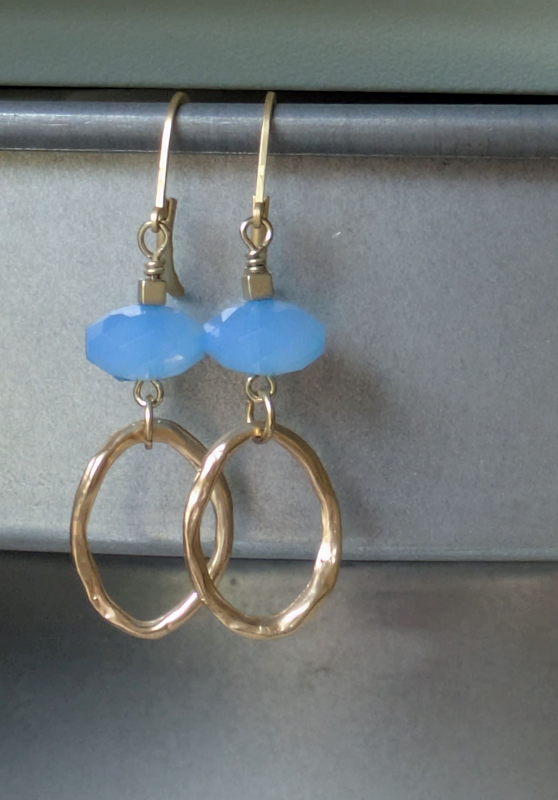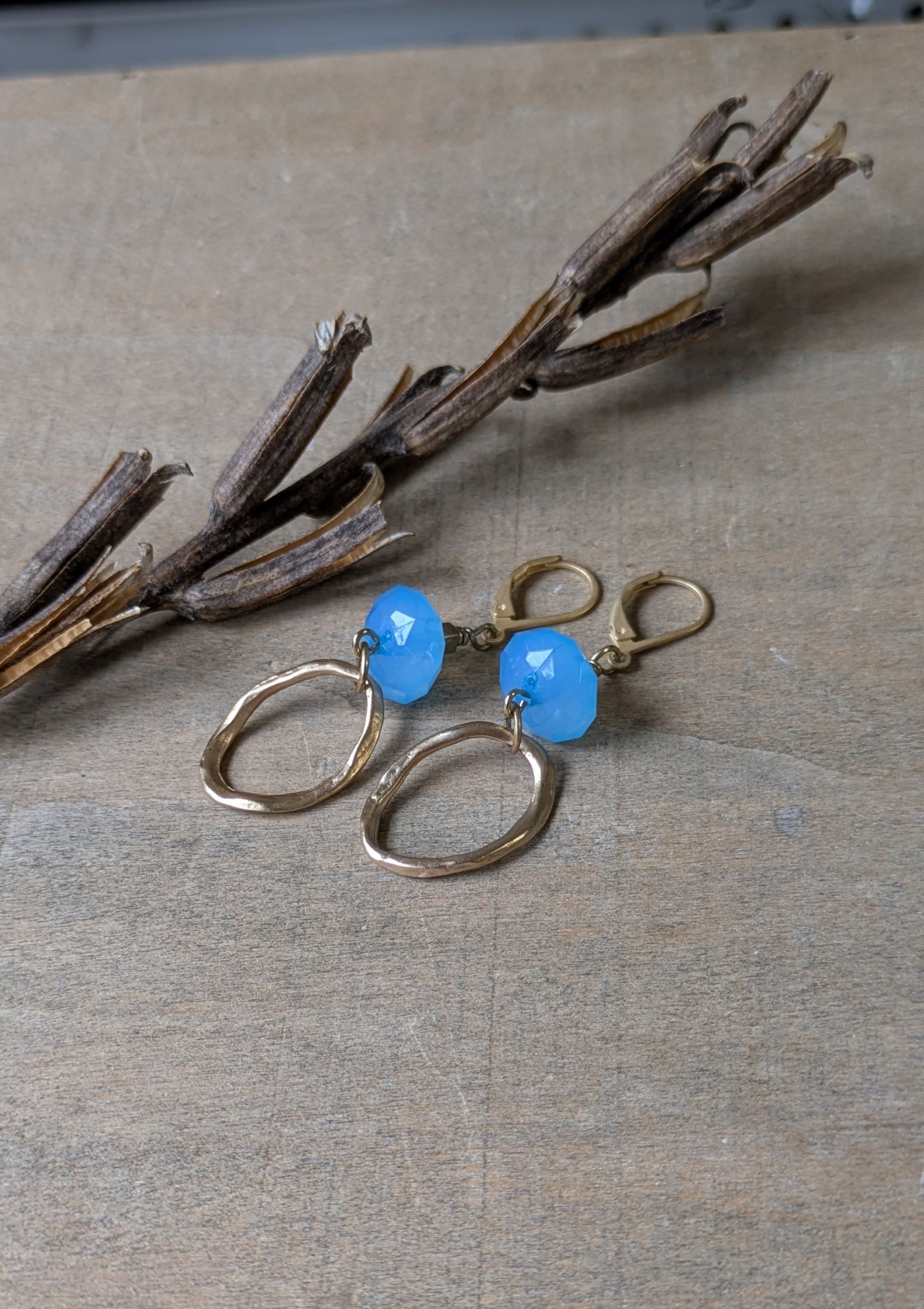 A faceted resin bead in a soft blue sits above a brass oval ring. Satiny brass lever back ear wires. Lightweight, shimmering with feminine sparkle.