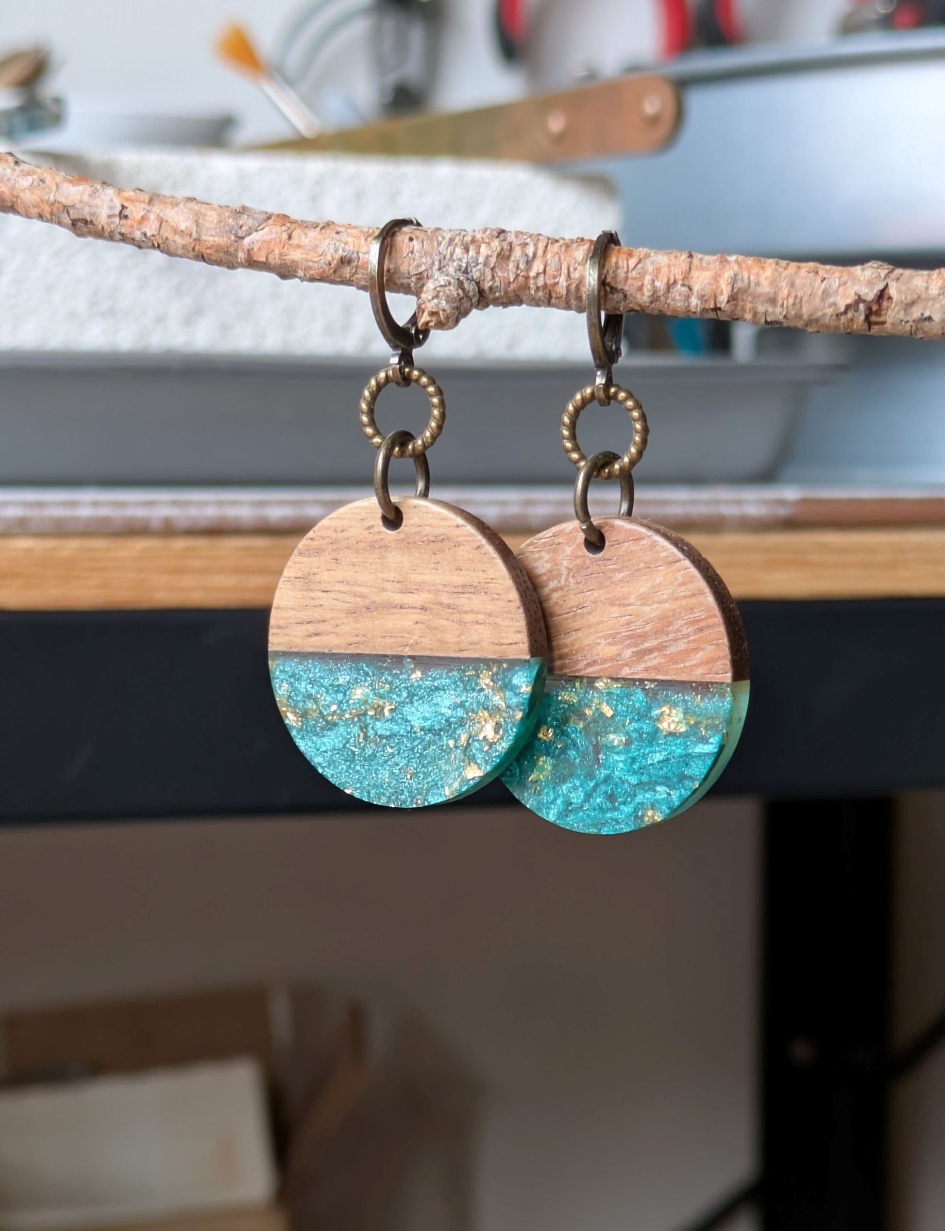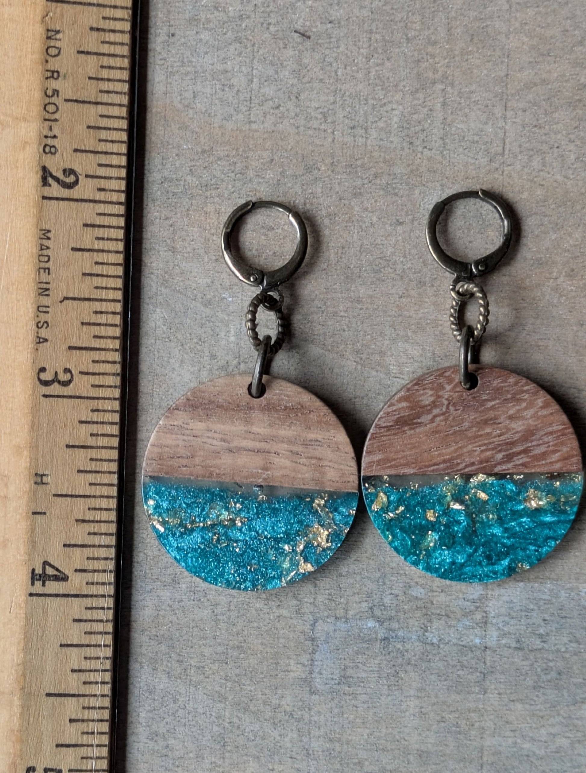 Sea green resin and wood join together to form these lightweight, unique dangle earrings. Simple, minimal with just a hint of sparkle created by gold flecks in the green resin. These measure 2 inches from the tops of the antiqued brass lever back ear wires.